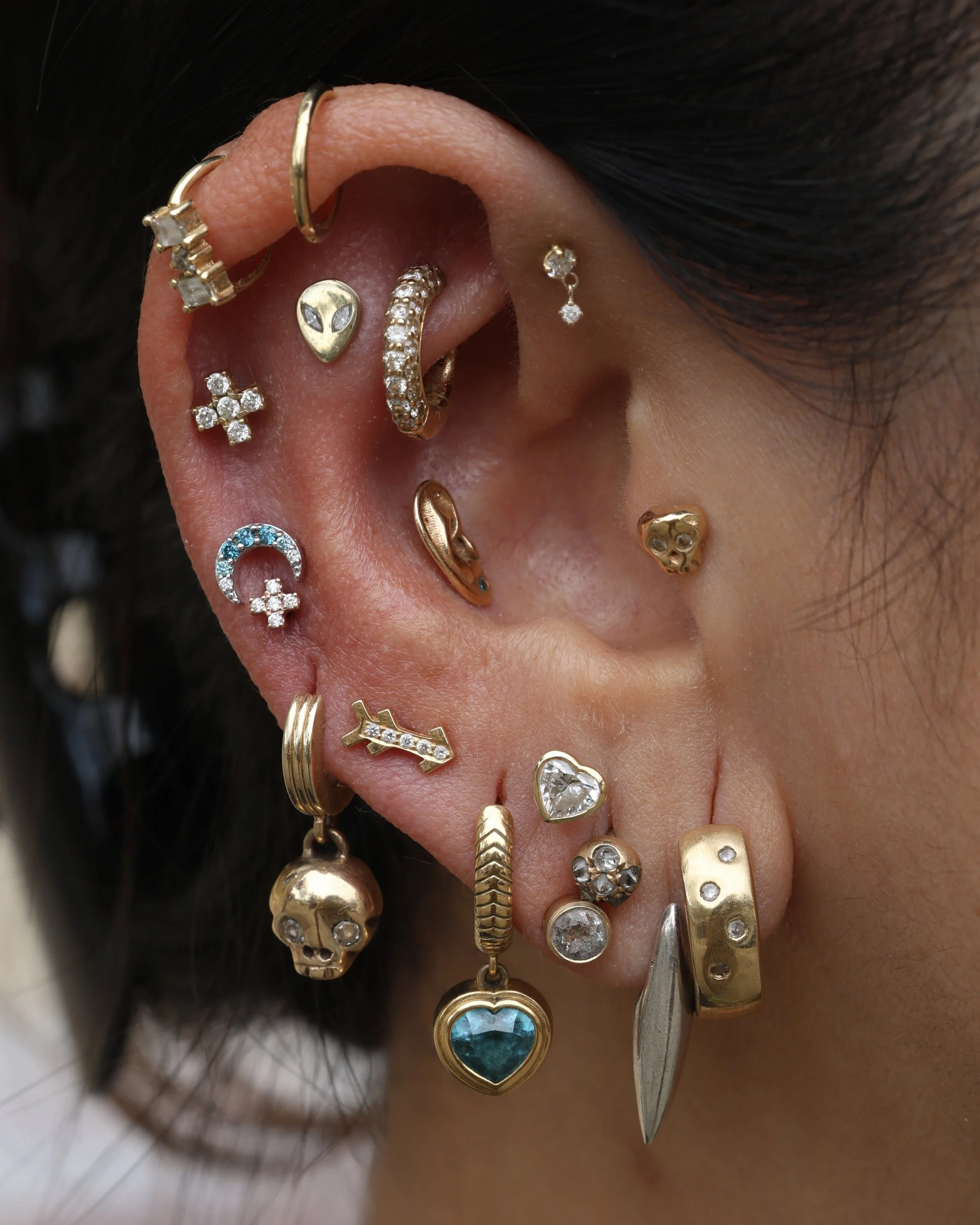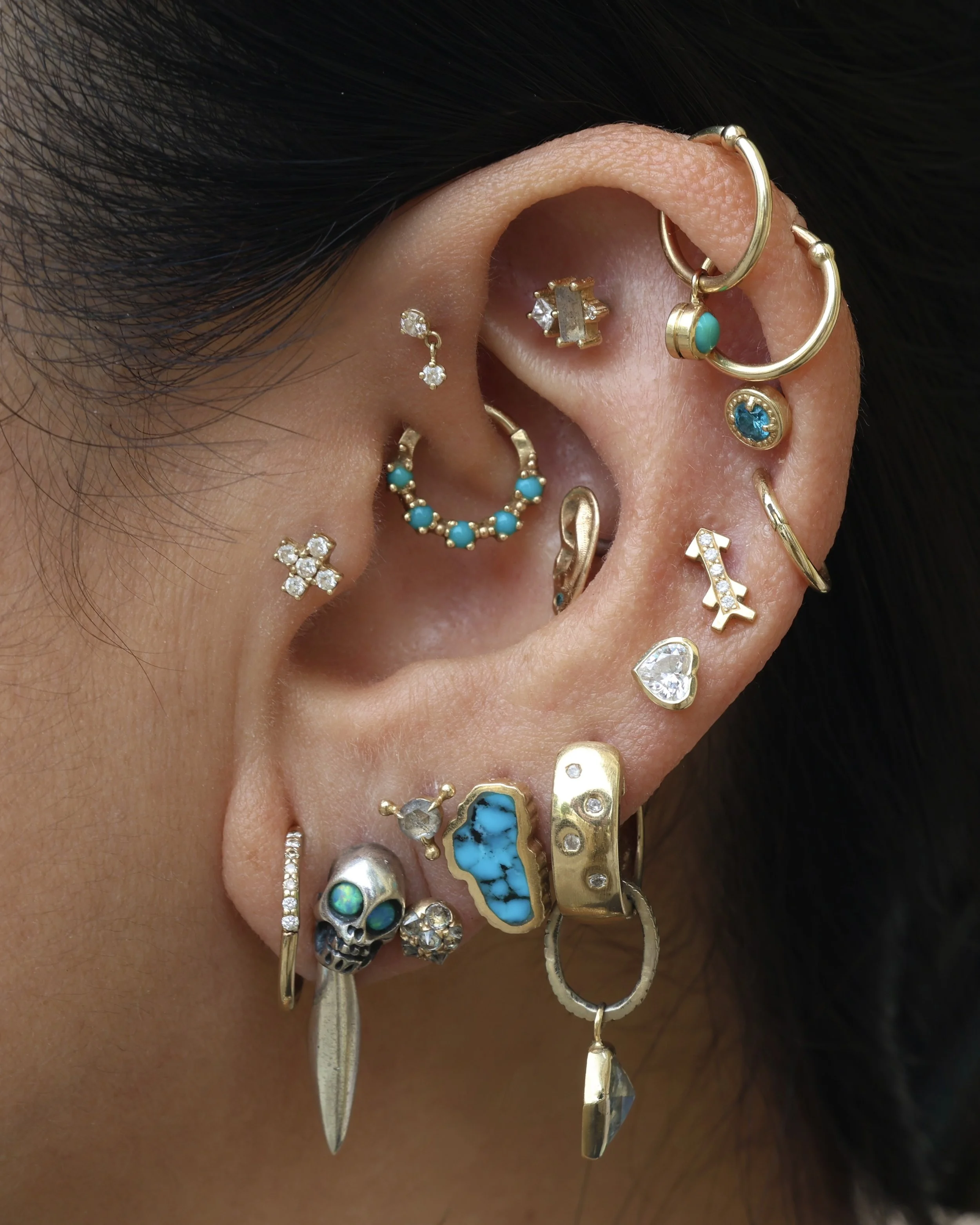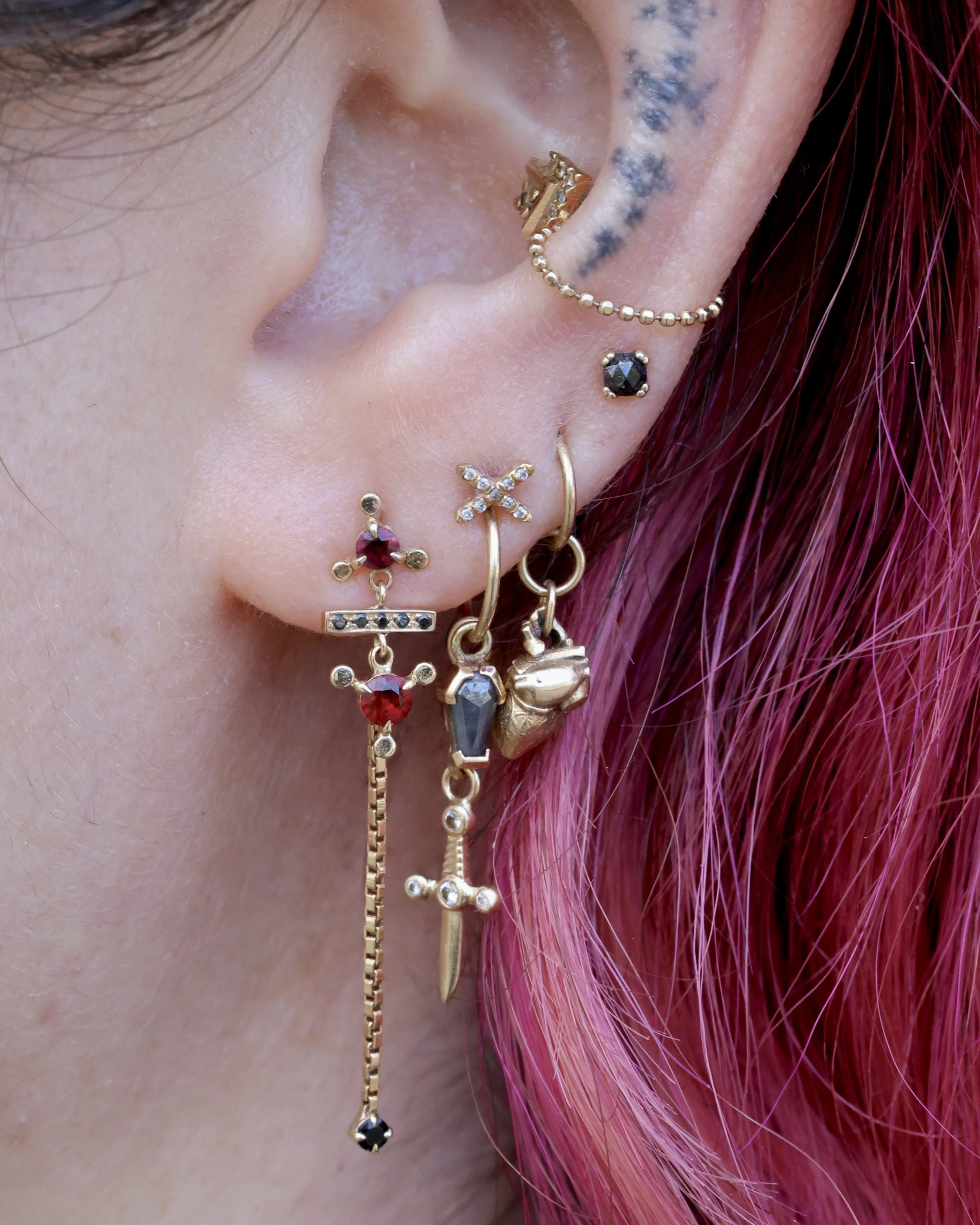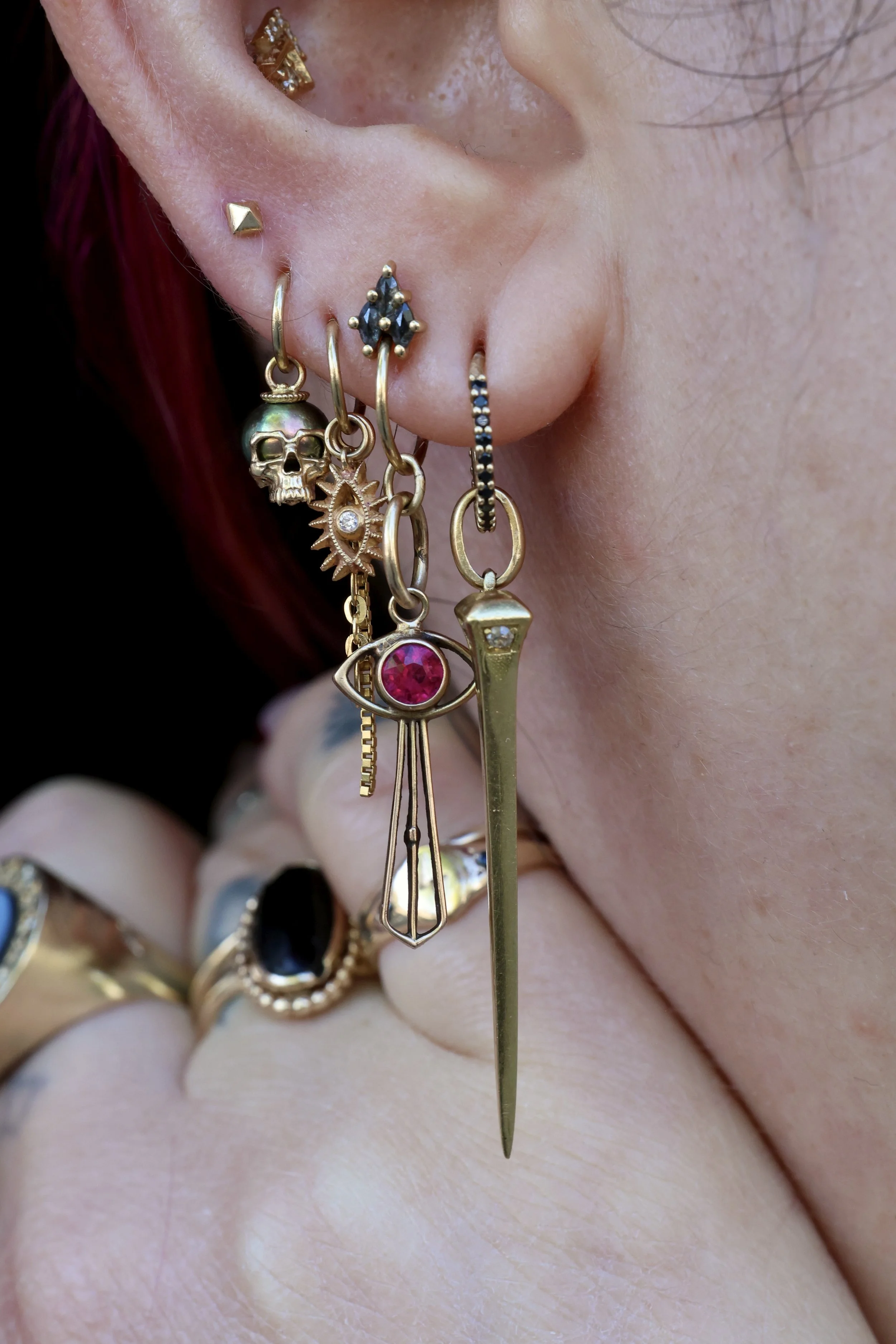 Minimal Link Hoops step 1: pick your ring! Simple Hinged Seamless Ring Diamond Telesto Seam Ring step 2: stack your charms! Cassiopeia Constellation Charm Evil Eye Double-Sided Dagger Pendant Point Pendulum Charm